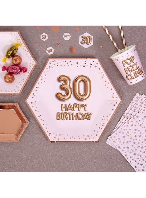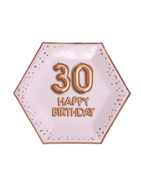 8 "30 Happy Birthday" sekskantede papirtallerkener - Glitz & Glamour Rosa & Rosegull